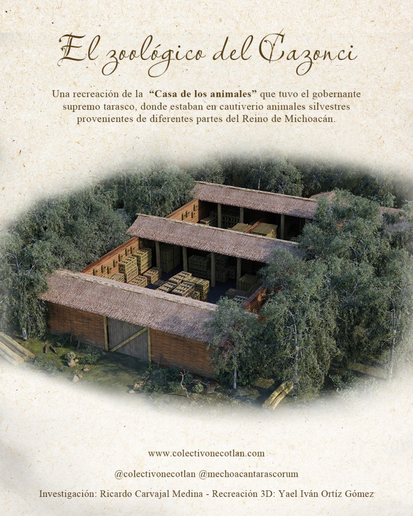 Junto a nuestros amigos de Mechoacan Tarascorum realizamos un proyecto de recreación del zoológico prehispánico del supremo gobernante tarasco. Básicamente nos preguntamos ¿cómo pudo verse este lugar en la antigüedad basándonos en documentación histórica?. De esta manera podríamos difundir parte de la historia de Michoacán de manera visual y con rigor histórico. También se busca explotar nuevas herramientas digitales para preservar la memoria histórica, educar e innovar en el ámbito de la divulgación.
